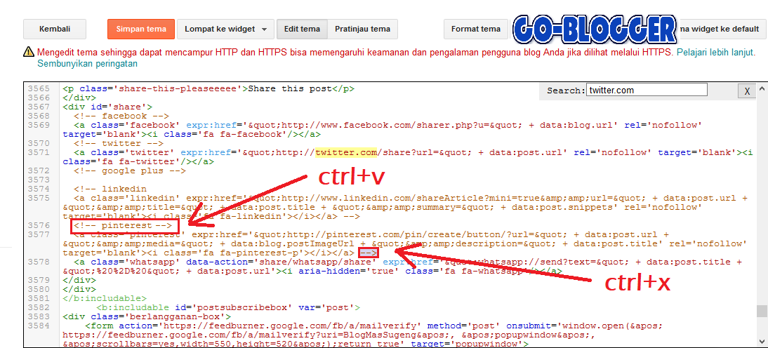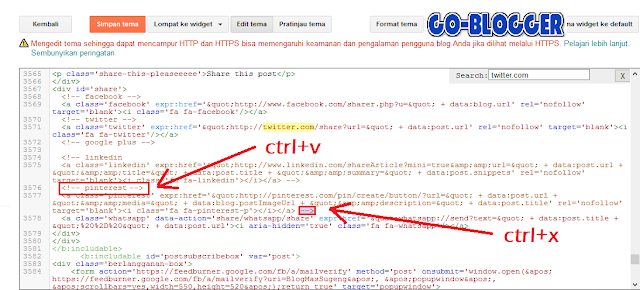 Ketiga Perhatikan gambar di bawah, setelah dihapus kode html Google Plus tadi, kemudian kalian potong kode yang saya tandai ctrl+X, kemudian kalian paste-kan (ctrl+V) di sebelah kode <!– pinterest atau pada kode <!– linkedin, terserah kalian.