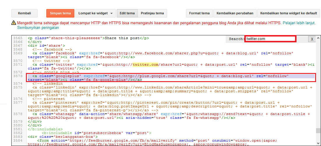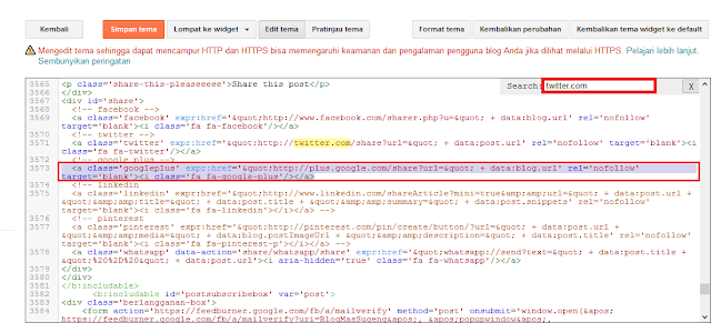 Kedua Kemudian klik pada kode html, setelah itu tekan ctrl+F kemudian ketik twitter.com. Maka nanti akan muncul kode tombol share twitter. Setelah itu cari kode tombol share Google Plus di bawahnya twitter seperti yang saya beri tanda pada gambar di bawah. Kemudian hapus kode html tombol Google Plus-nya karena sudah tidak aktif.